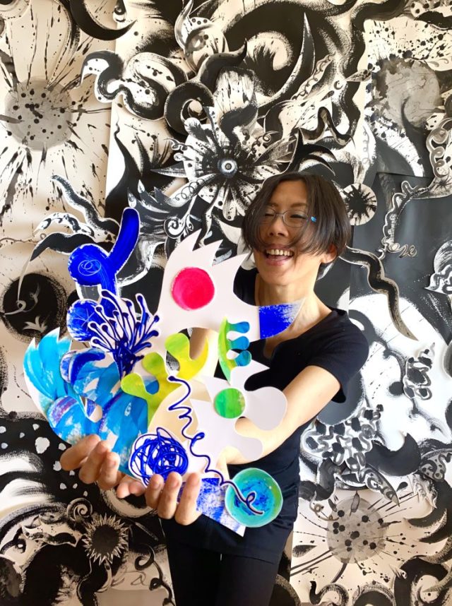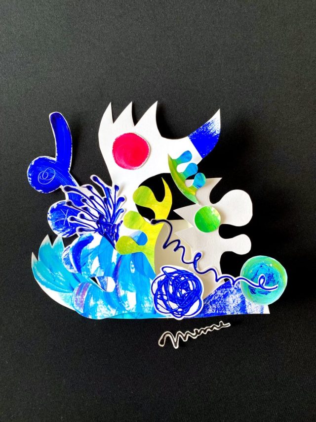 珊瑚礁のイメージで。命を生み、育む水、川、海。母の胎水もまた。コラージュ半立体アート。