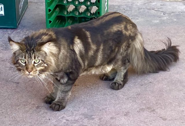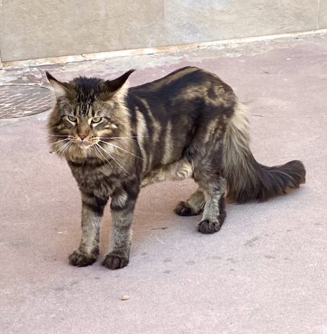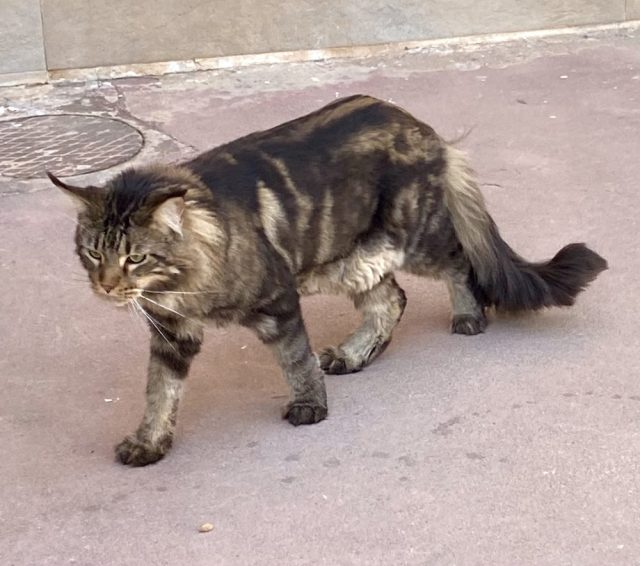 帰り道、海外通りをのんびり歩いていると、突然目の前に不思議な生き物が現れた。ってか、「猫」なんだろうけど、なんかシルエットが違う。