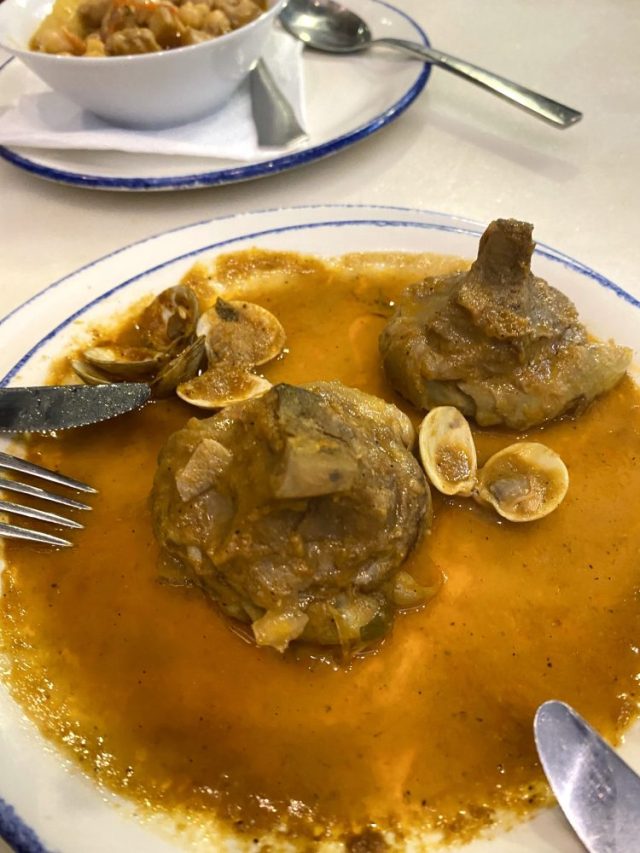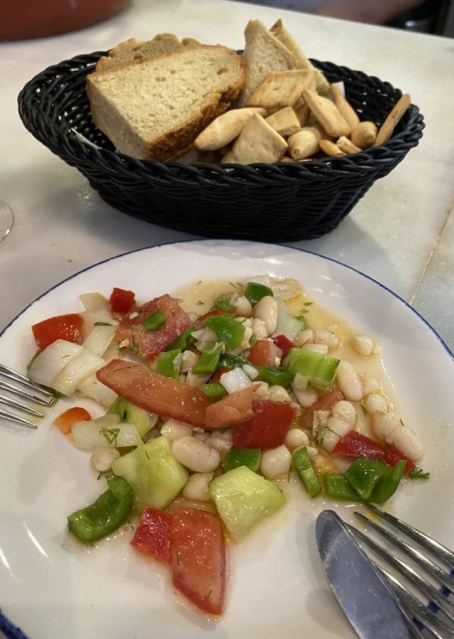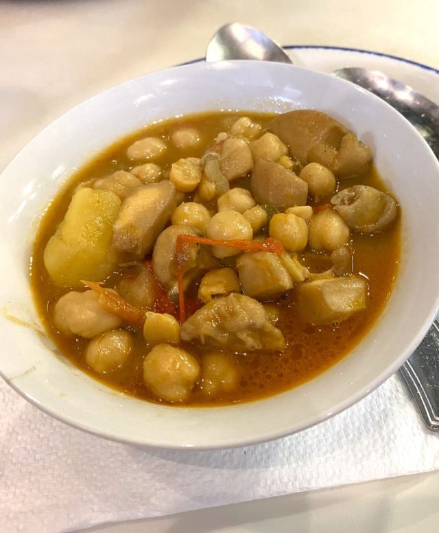 カジョス(ひよこ豆と臓物の煮込み)、アーティチョーク、豆と野菜のサラダ、ガスパチュエロ(マヨネーズ入りのスープ)・・・