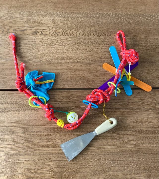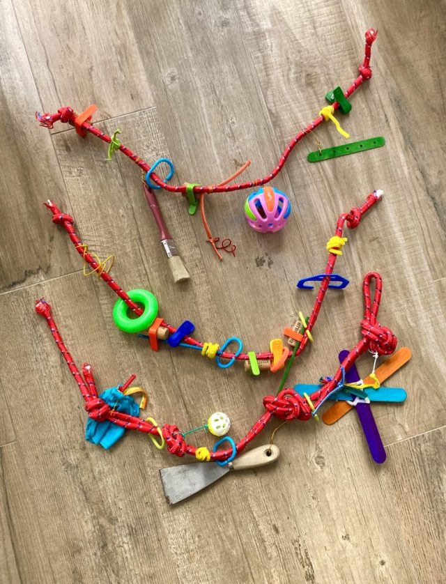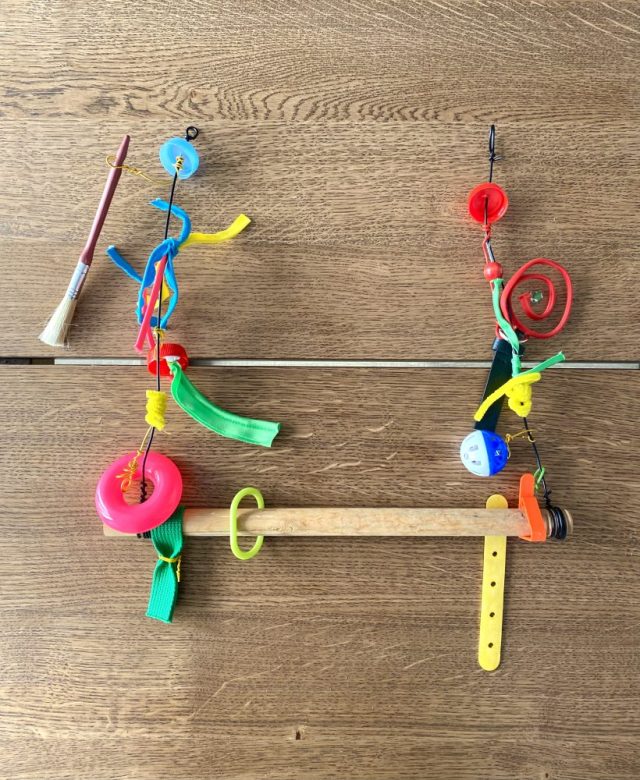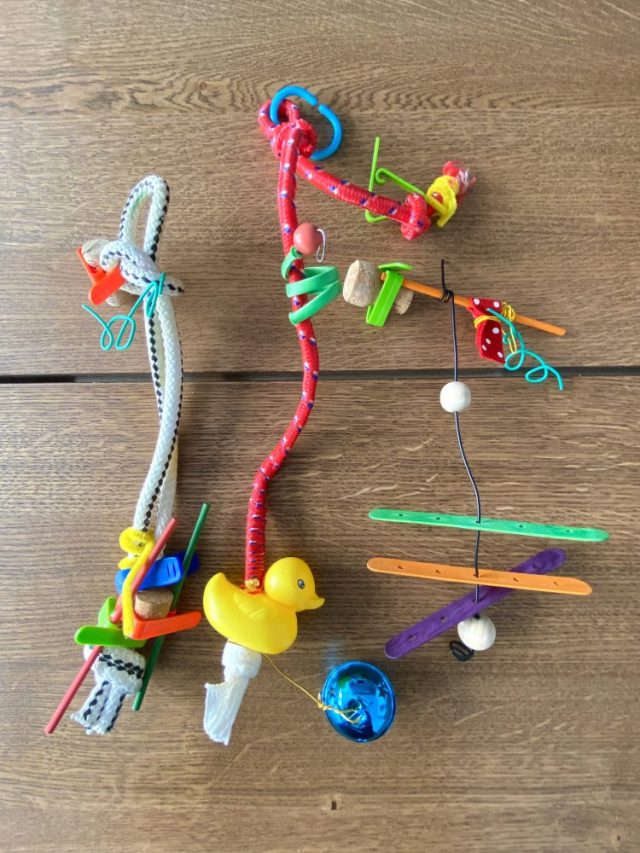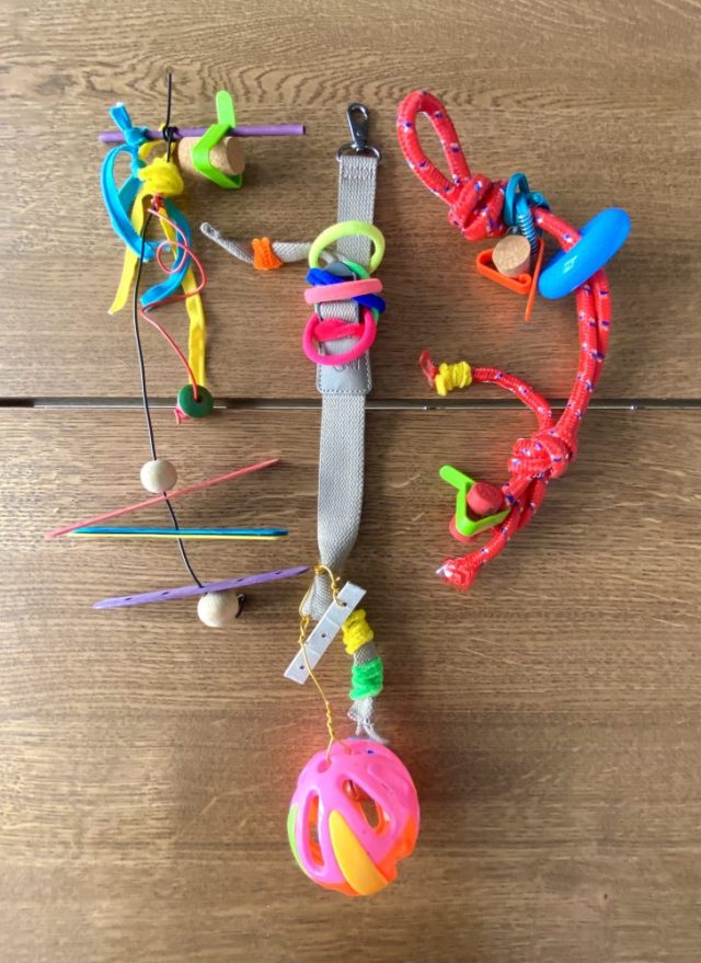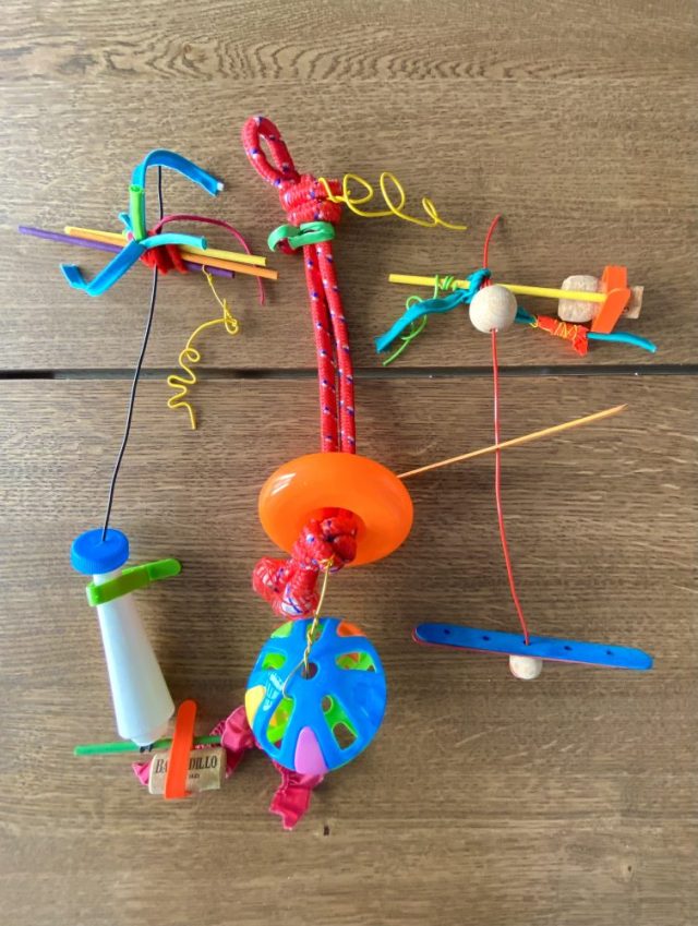 あるもの何でも使って。木片、コルク、ワイヤー、布、ひも・・・。音が出る鈴や金物も取り付けて。かじる、つかむ、乗る、壊すのが大好きなオウムたちへのプレゼント。