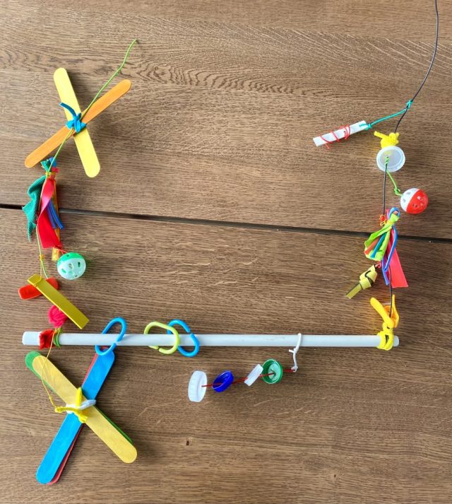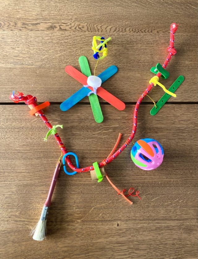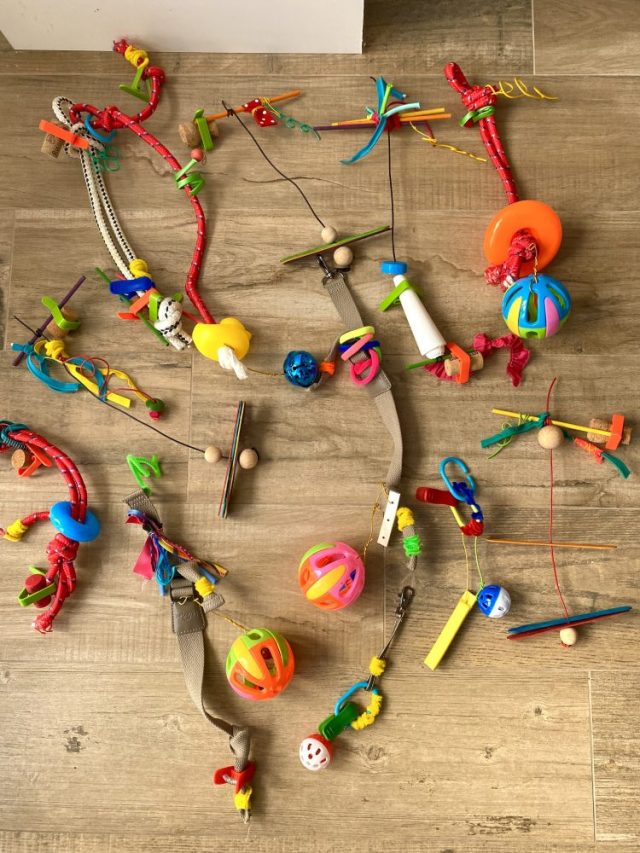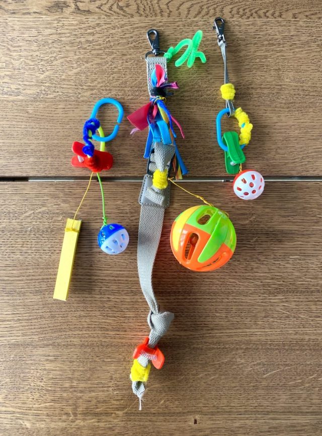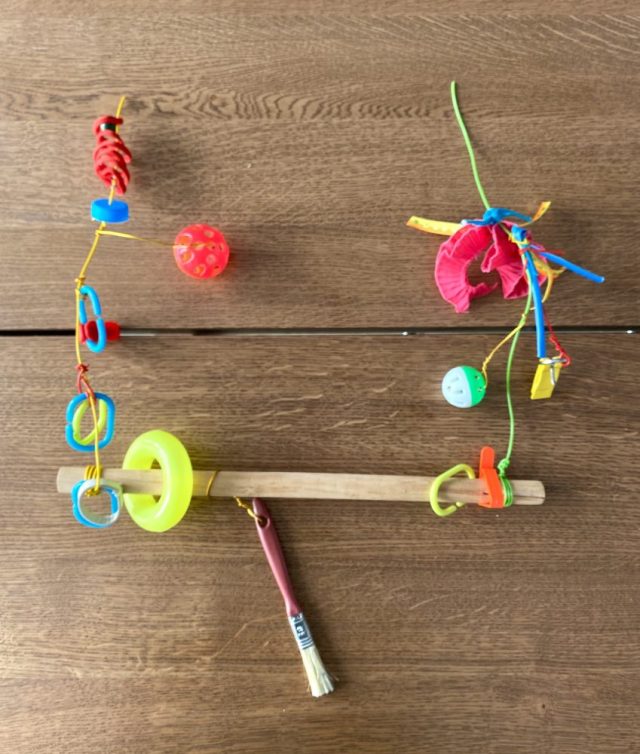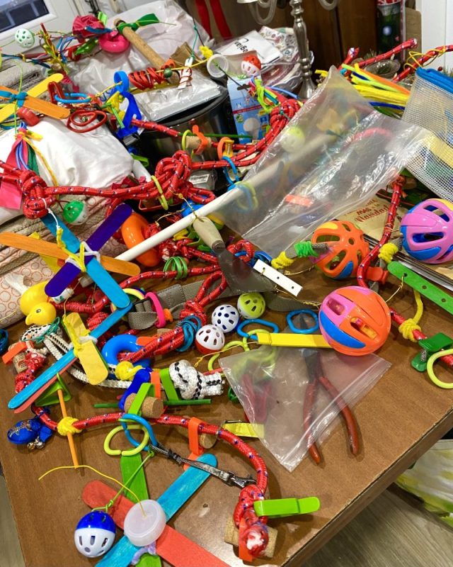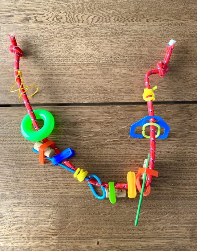 あるもの何でも使って。木片、コルク、ワイヤー、布、ひも・・・。音が出る鈴や金物も取り付けて。かじる、つかむ、乗る、壊すのが大好きなオウムたちへのプレゼント。
