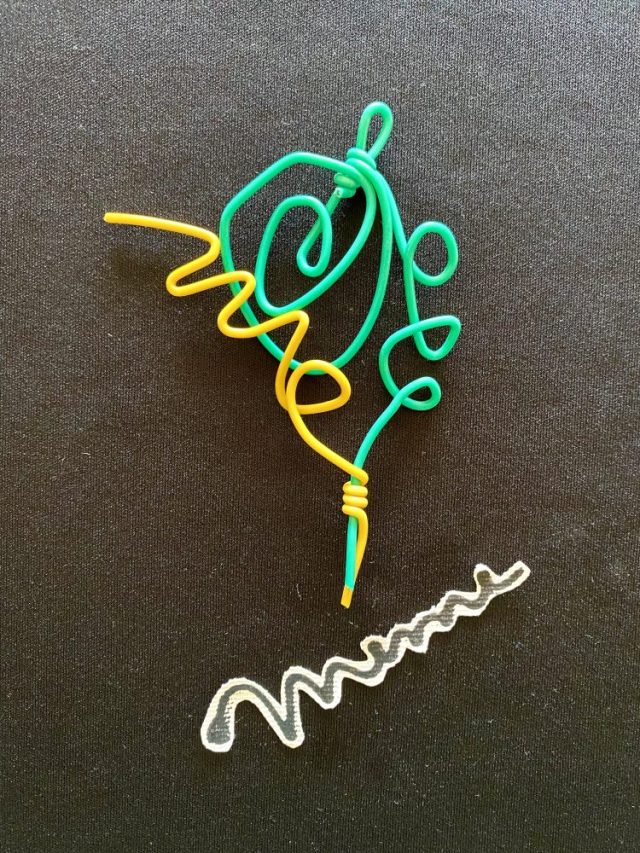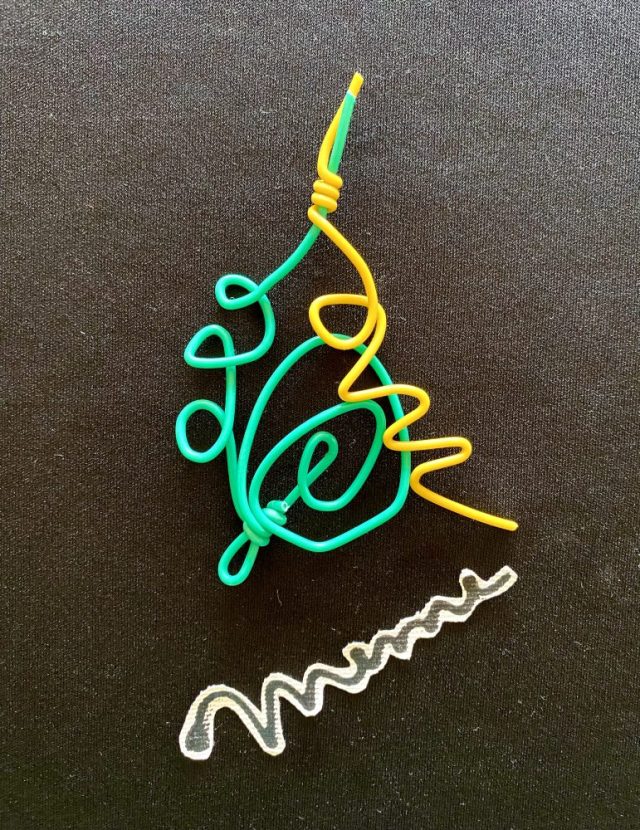 「Olè(オーレ)」の文字が、くるくると踊る。針金アート。ネックレスになるようにしたった〜(笑)。