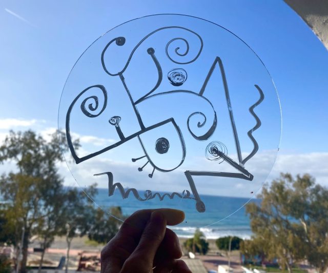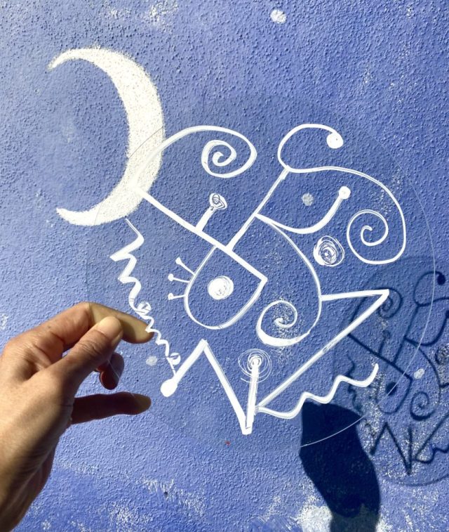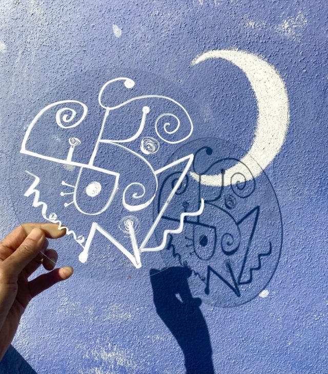 うちにあったガラスにペイント。太陽の光で「影」なり、壁に浮かび上がるのもおもしろい。いつか「窓ガラス一面」にペイントしてみたい。濡れ布巾で、簡単に消せるのもいいよね。