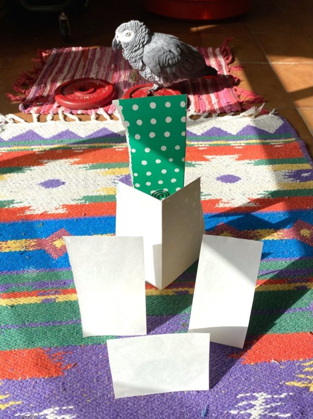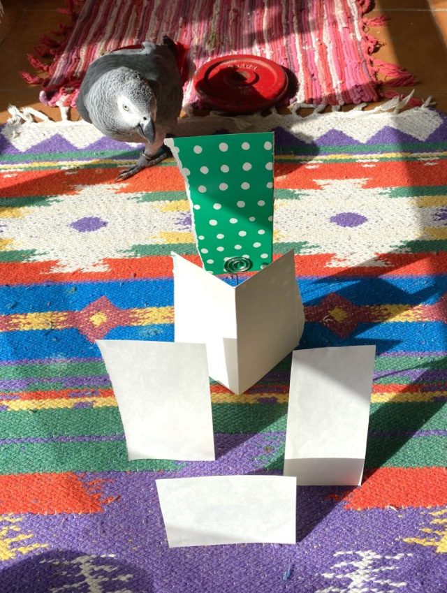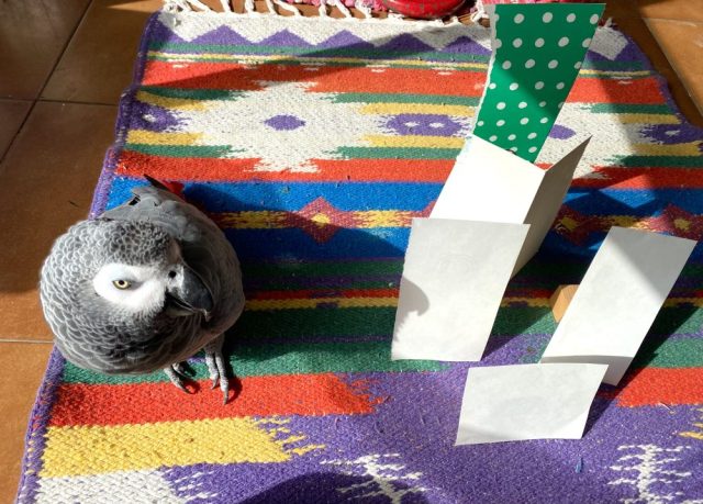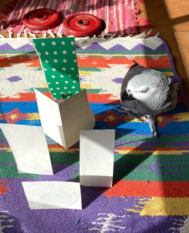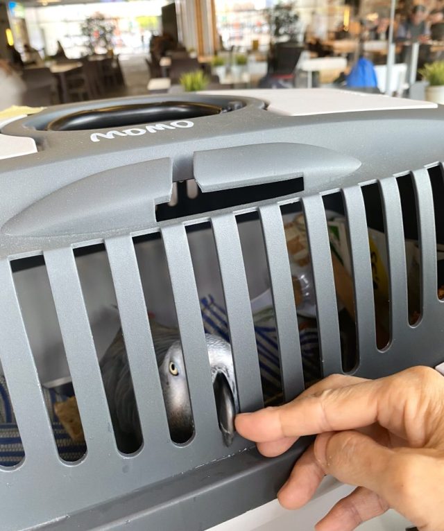 リラックス〜。テーブルに鳥かごを乗せて。オウムも小さな声で「ひゅー」「ぷぷっ」。おしゃべりしながら、キャリーの中で軽く運動。ほっとできてよかった。束の間の平穏。そして、ついに。