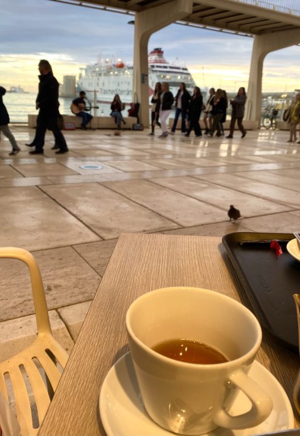 クルーズ船を眺めながら、テラス席でホットティ&クロワッサン。暖かいマラガだから、のんびり外でおしゃべりしていられる。