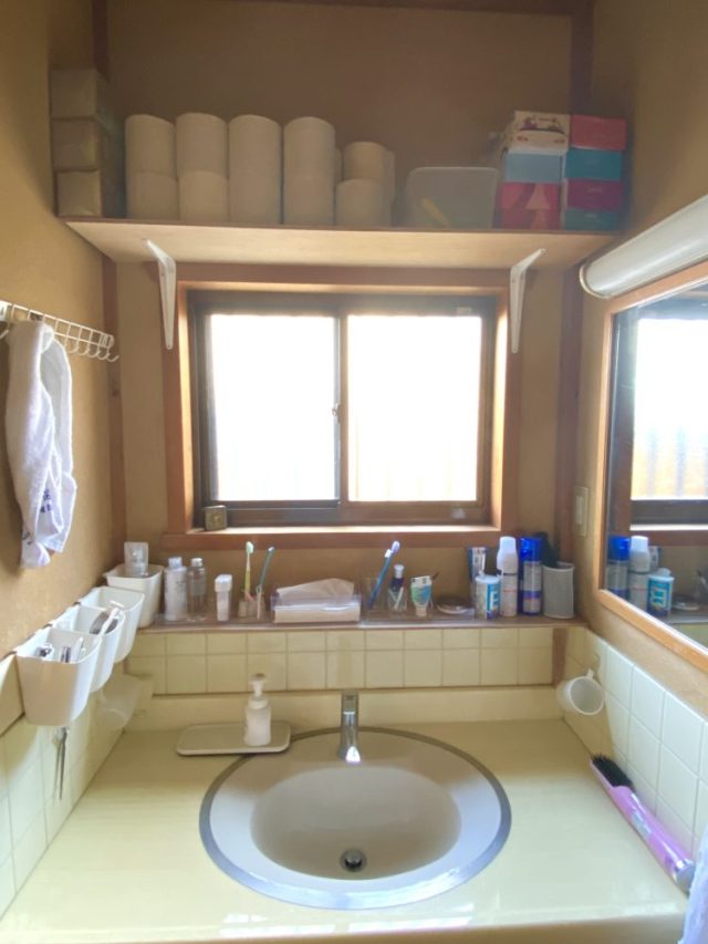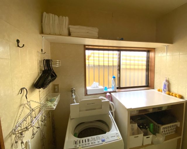 縁側に物干しコーナーを設置。洗濯機周りや洗面所周りを整理、さらに棚をつける。うちは純和風の造りなので、暖房のついた部屋から一歩出ると