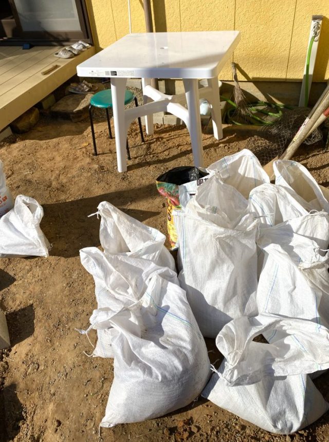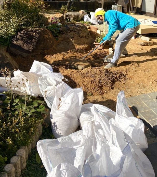 これが大変。小石まじりの土は、めちゃ重いのだ。ざっくざっくとクワで耕し、シャベルですくい出していく。「小石」「小石と土」はそれぞれ分けて土嚢袋に。縁側から作業を見ていた父が