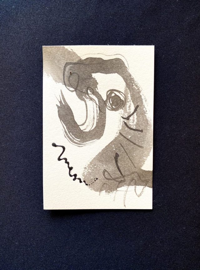 「月」文字がひざまづき、祈る。日本の墨汁はなんて優れた画材だろう。濃く、薄く、味わいがあり。アクリル絵の具とはまるで違う、広がりと深さを持つ。