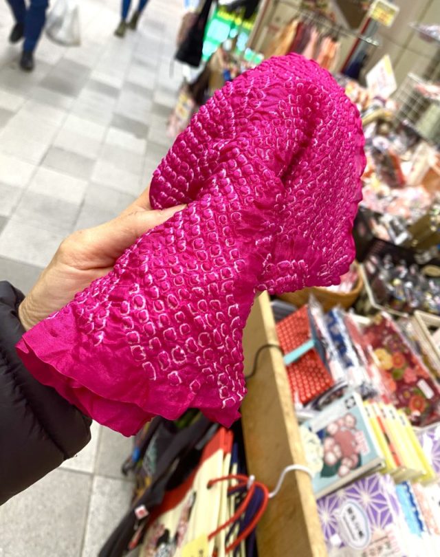 に惹かれ、ふらふらと近づいて行く。ビビッドなピンクがすてき〜(写真)。このままスカーフにできそう。これでなんと500円。さっそく自分へのプレゼントに。実はこの後、大須シネマで
