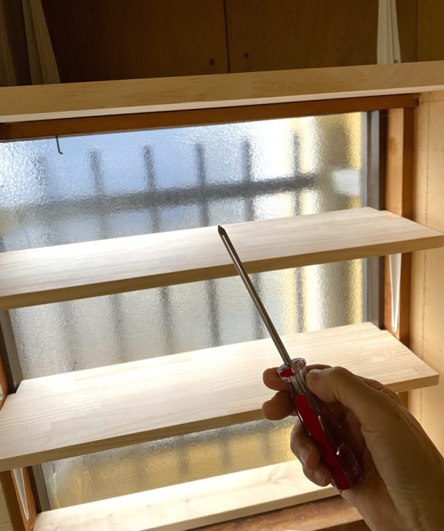 と汗が噴き出す。額や背中から熱気が〜。ノコギリ、巻尺、キリ、ドライバー。次々と道具を変えながら、ひたすら棚の取り付け。