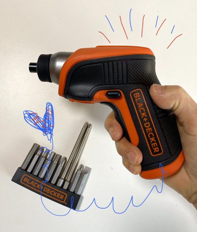 クギをねじ込んだり抜いたり、穴を開けたり。めちゃ役立つやんか〜(写真)。うれしー。さっそくグリップを握り、手応えを確かめる。