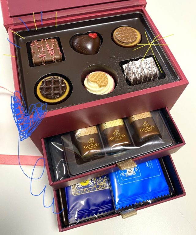 思いがけない贈り物に、わくわくして包みを開けると。なんと。3段引き出しのかわいらしいチョコレートが!さっそくお礼の電話を入れると