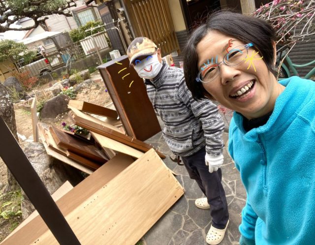 Tさんと父の3人で、ほっこりティータイム。これからまだ片付けはあるけれど、なんとかここまでたどり着いた。Tさん、ありがとう〜〜〜!1人だと「作業」だけど、みんなでやると「イベント」だよね(笑)。