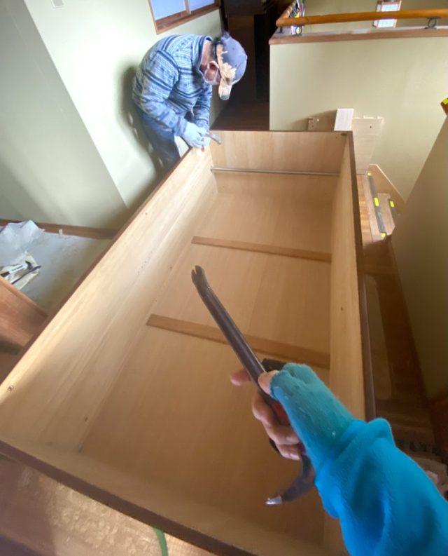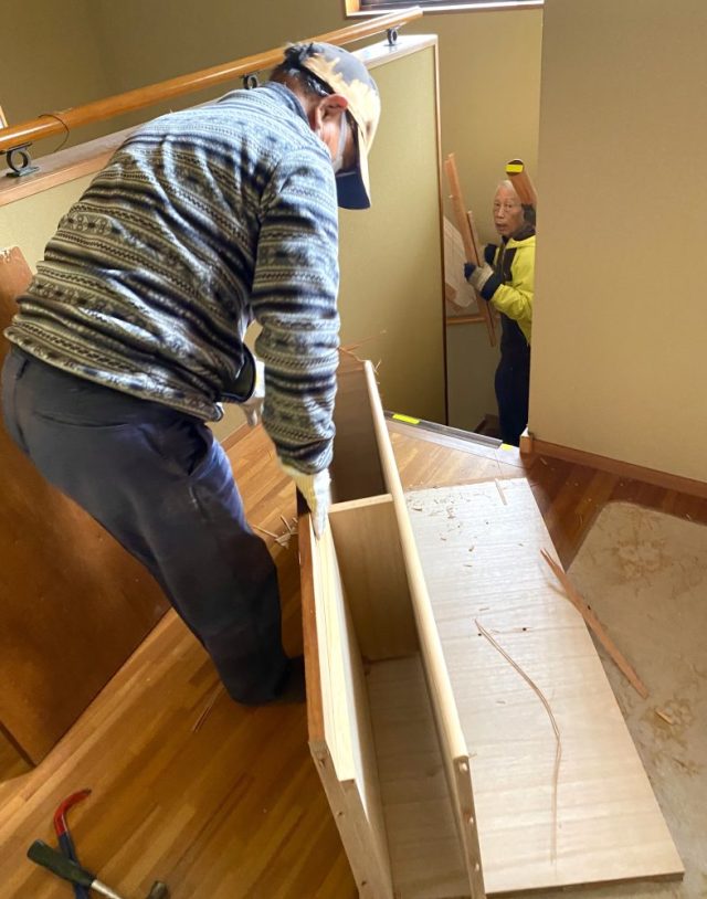 悲報。さっそく父の親友Tさんが、工具持参で駆けつけてくれる。ここまで、できる限り自力で進めてきたけれど、どうしても外れない板があちこちに。