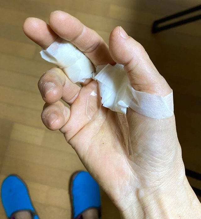 Tさんの笑顔が輝く。休む間もなく、次は板を2階から1階へ下ろす。さらに、玄関先へ移動。何十枚とあるので、けっこう大変。なんか手が痛いと思ったら、切り傷とトゲ。応急処置をして