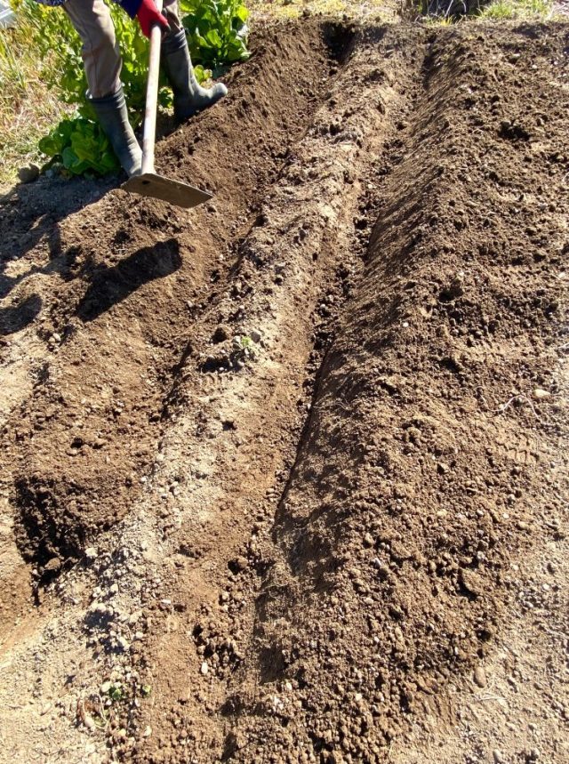 「ジャガイモは切った面に草木灰をつけます」「そうもく?ばい?」「雨の降らない週にまきます。水がきらいなので」「天気予報を見てまく日を決めるんですね?」「もう石灰はまきました?」「ん?」