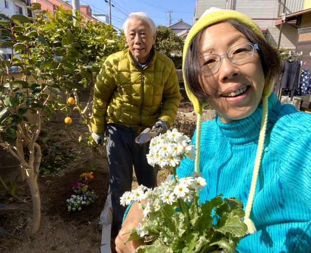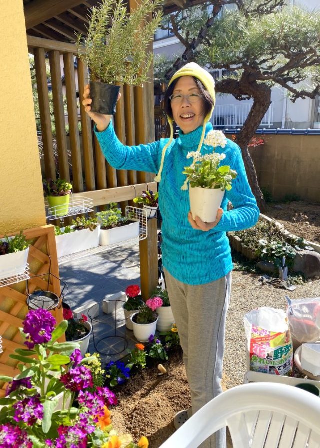 「楽しむ庭になったね。このスペースには何を植えるの?」「野菜の予定です」「私も庭で野菜を作ってるのよ」「きゃ〜、教えてください」