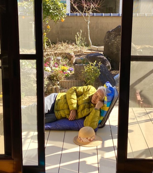すぐに、すうすうと寝息を立て始める父(写真)。直接、太陽を浴びながら眠るって、最高なんだから〜。