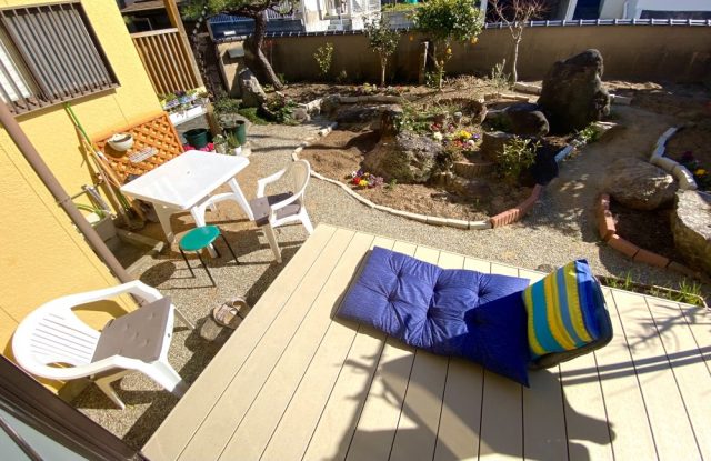 って、庭へ誘導。よしよし。使える庭、楽しむ庭へ。洗脳は確実に進んでいる。そっと覗くと、3人でほっこり、ガーデンチェアーとウッドデッキに座っておしゃべり。これっしょ。