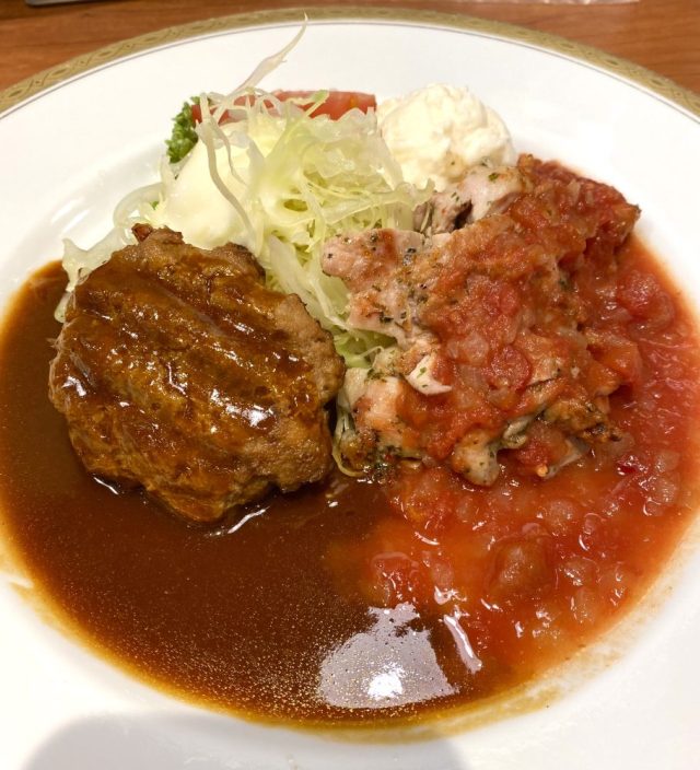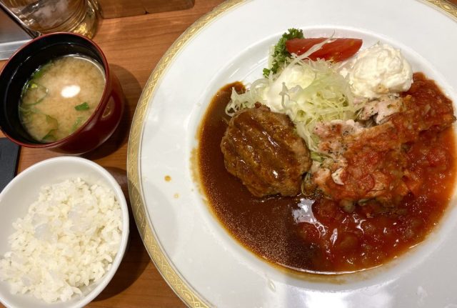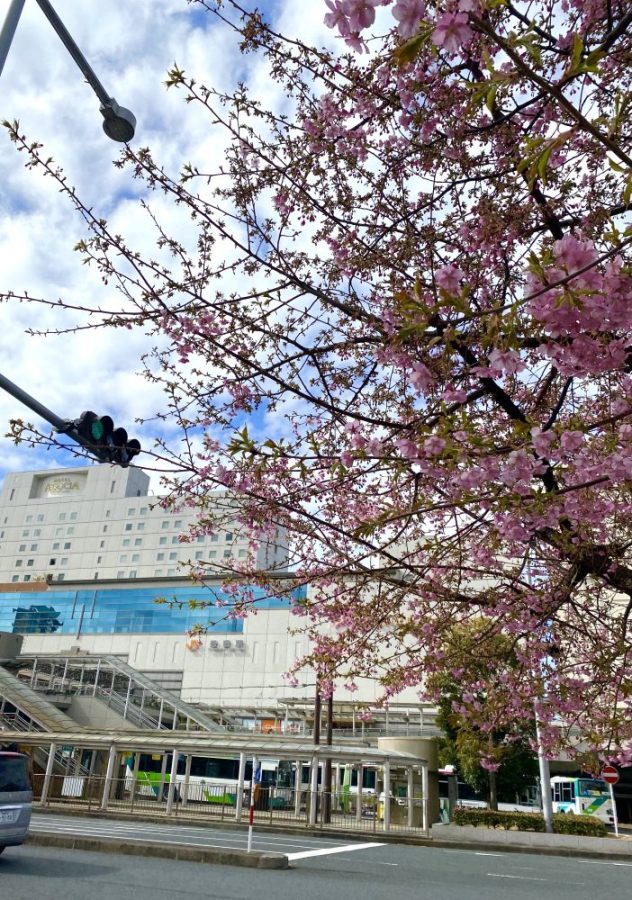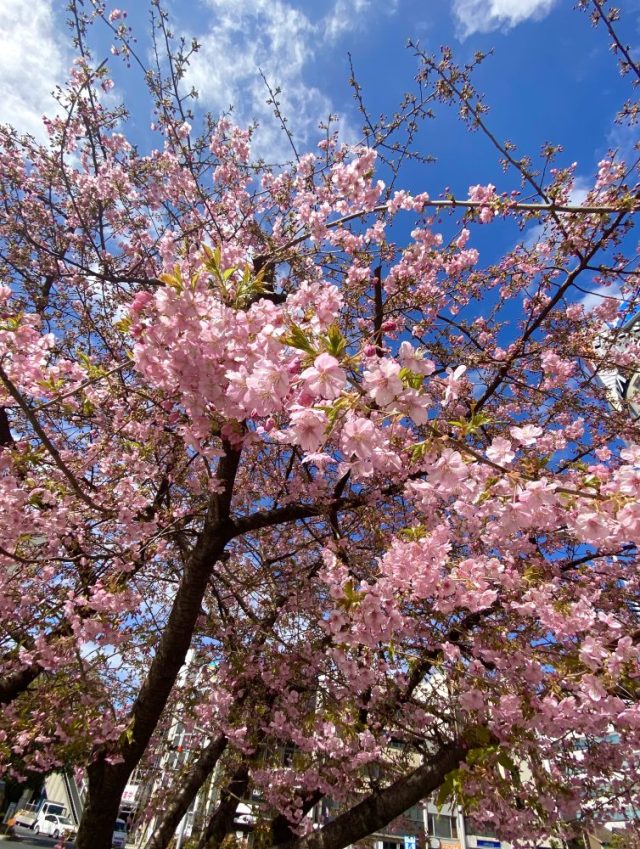 歓び(笑)。ハンバーグ&肉プレートをおかずに生ビール。その後、白いご飯を平皿へ投入。ソースを最後まで味わう〜。大満足。ランチの後は再び駅前へ。街路樹の河津桜がほぼ満開。