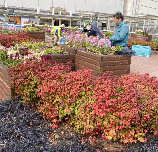 心洗われるー。作業員のおじさま、お兄さまが、色とりどりの花たちをカゴから花壇へ。春らんまん。駅前が、園芸センターみたい(笑)。お花見気分でふらふら歩いていると