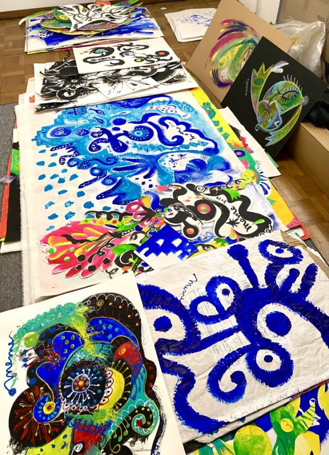さて。作品の大整理は続く。小中サイズの作品は、全て収納ボックスへ保管完了。あとは、床に置かれた中大サイズの作品のみ。ボックスに入らないから