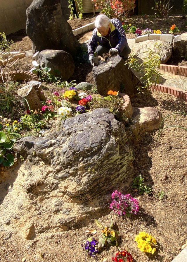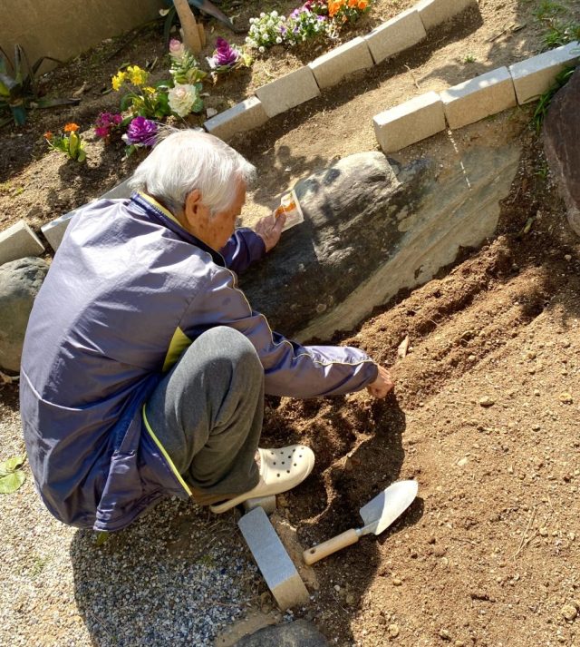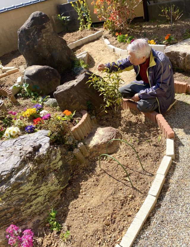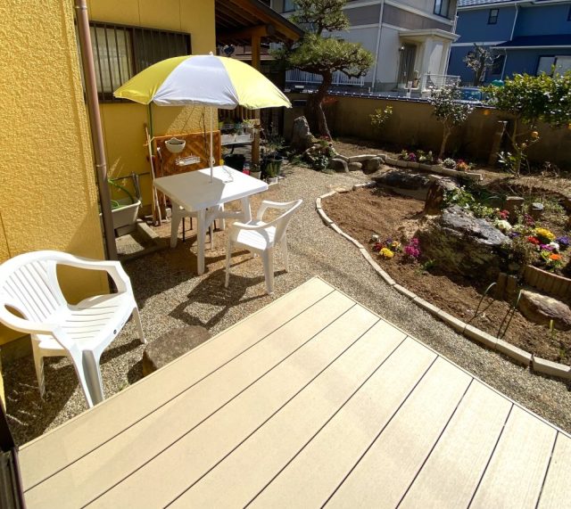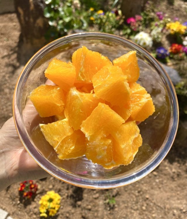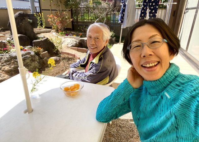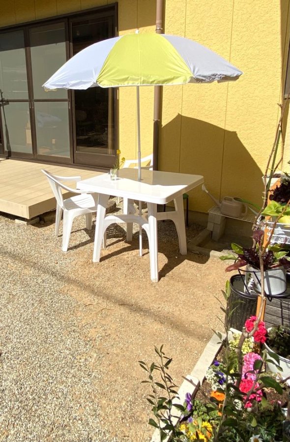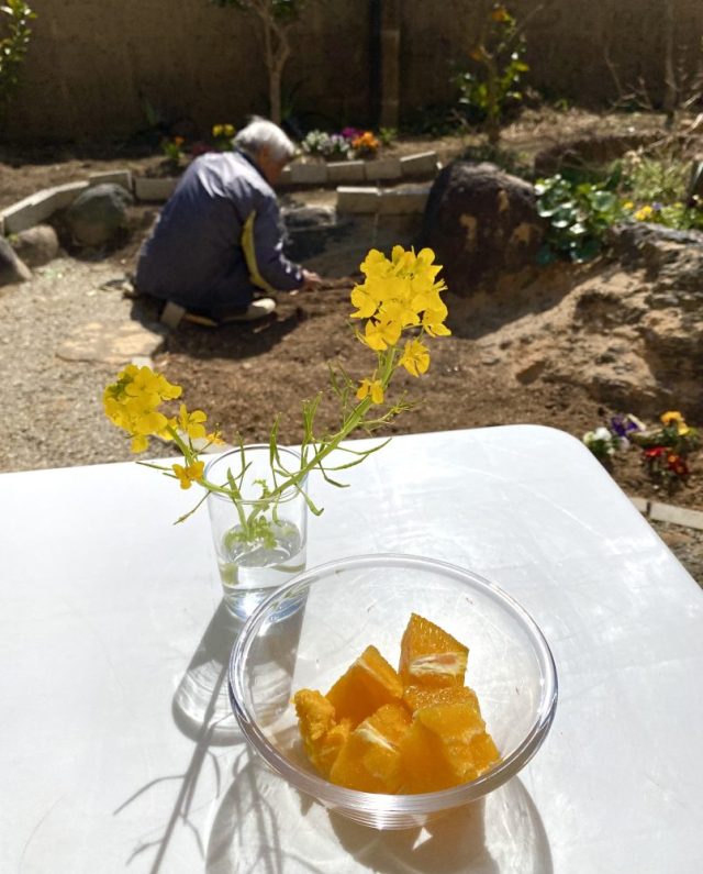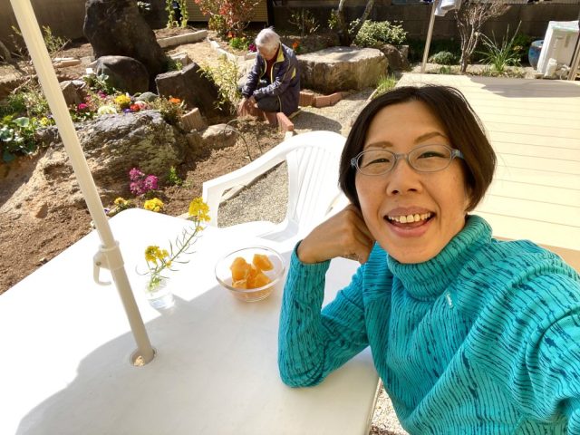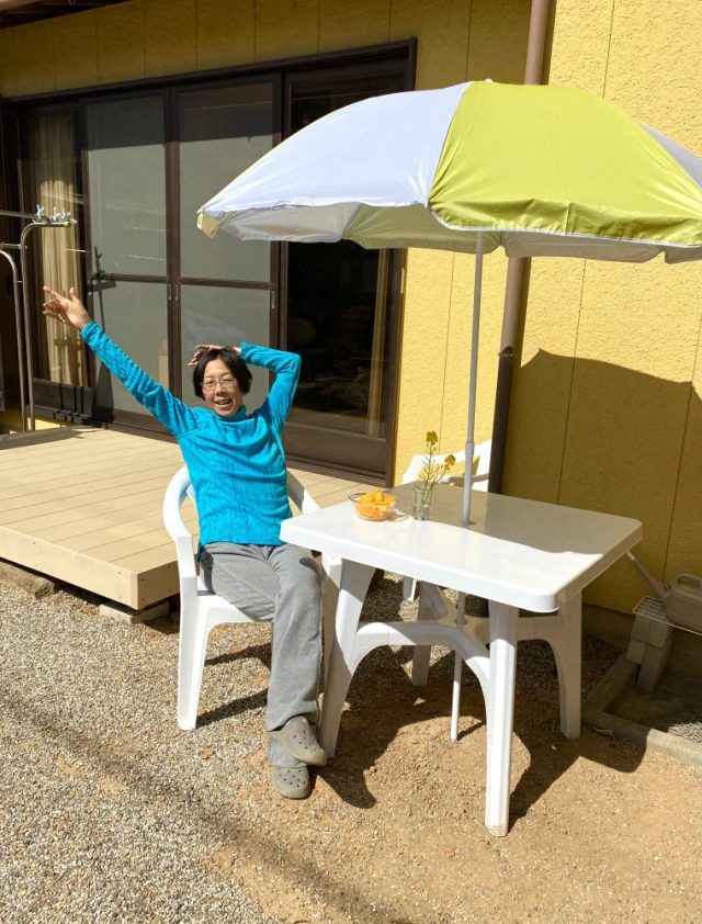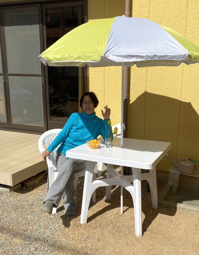 和風の家に、めちゃ似合う(笑)。お隣さんからは「あのパラソルの家」と呼ばれているかも。いただきもののオレンジをつまみながら、ひと休み。父はニンジンの種をまく〜。