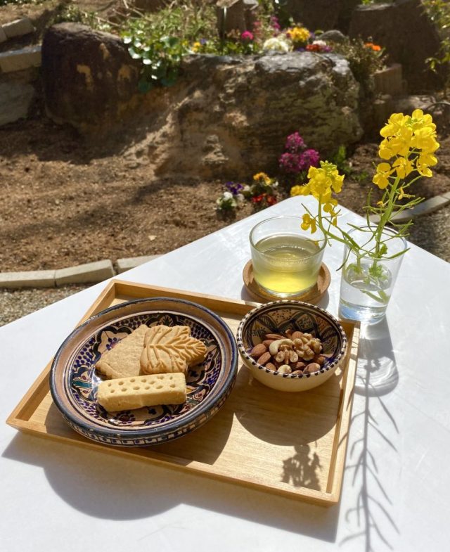 太陽を浴びながら。緑茶とナッツとビスケットでエネルギーチャージ。原材料の成分表示、その数「4(小麦粉・バター・砂糖・塩)」「7」「15(日本製)」の3個を食べ比べる。
