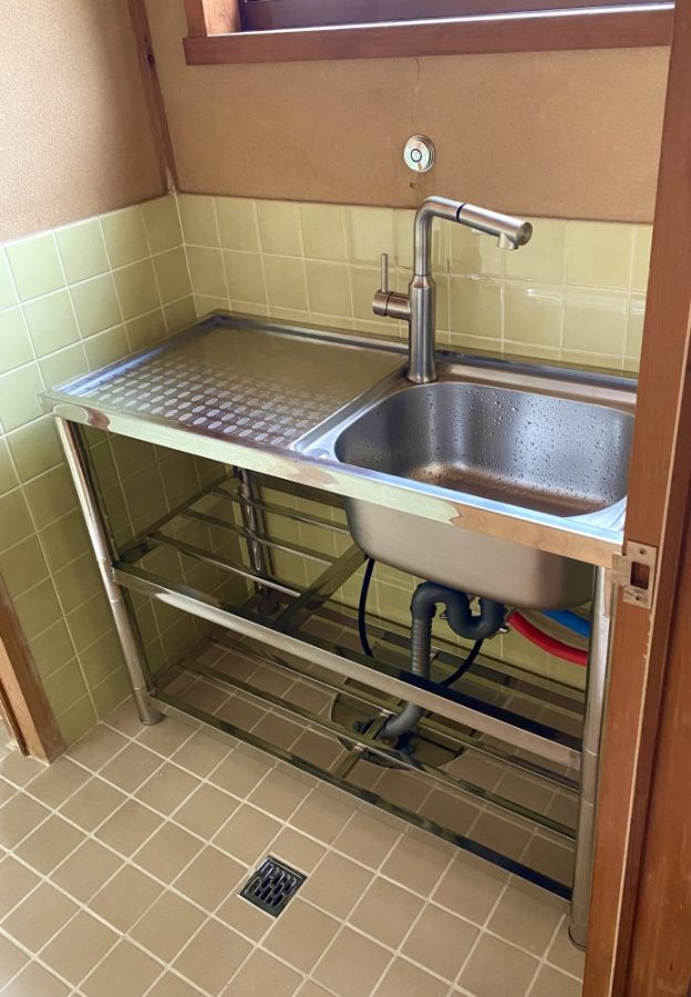 洗面所とは別の。絵の具って、どうしても飛びはねるし、こびりつく。気兼ねなく使えるスペースがほしい。そこでYさんに相談し、屋外でよく使う安物のステンレスシンクを使うことに。