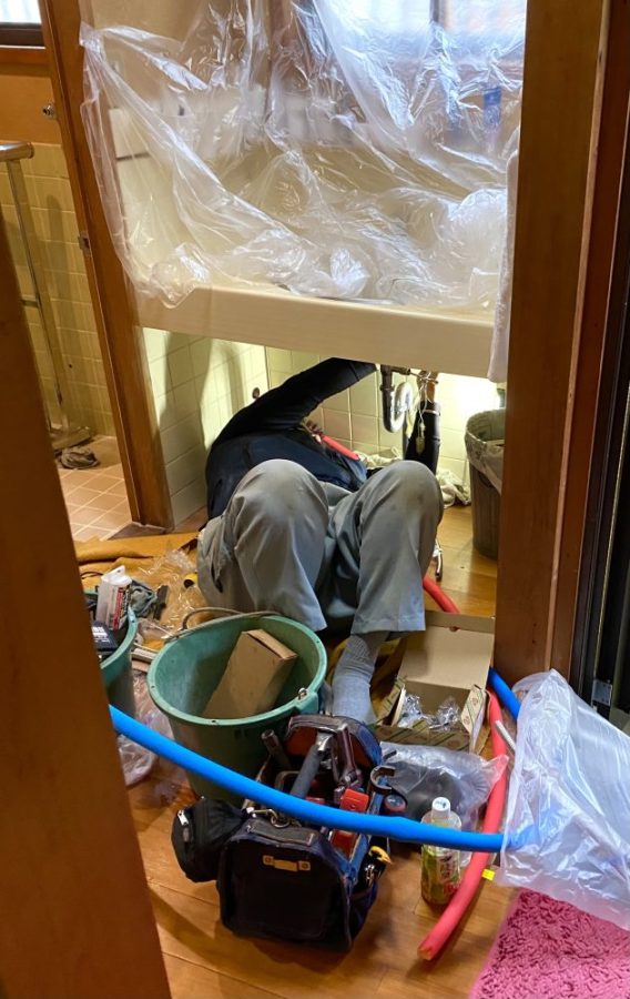 職人さんの姿。ええなぁ。配管作業はひざまづいたり、寝っ転がったり(写真)。大変や〜。ようやく小便器が取り外され、ぽかっと空いたスペースに心奪われる(笑)。なかなか見られるもんじゃない。そして、いよいよステンレス流し台の登場。