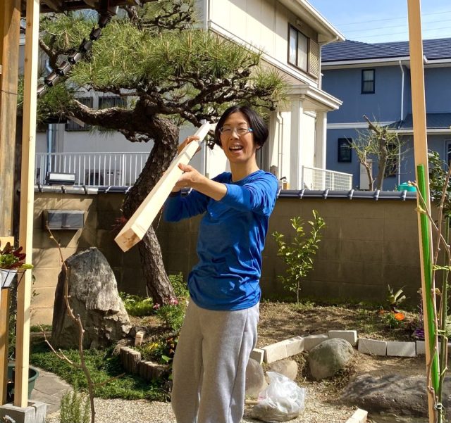 庭で父とシュミレーション。角材を、まさに両手で持ち上げた瞬間、玄関から「こんにちは〜」と工務店のYさんが現れる。バンザイをした状態で、振り返ると