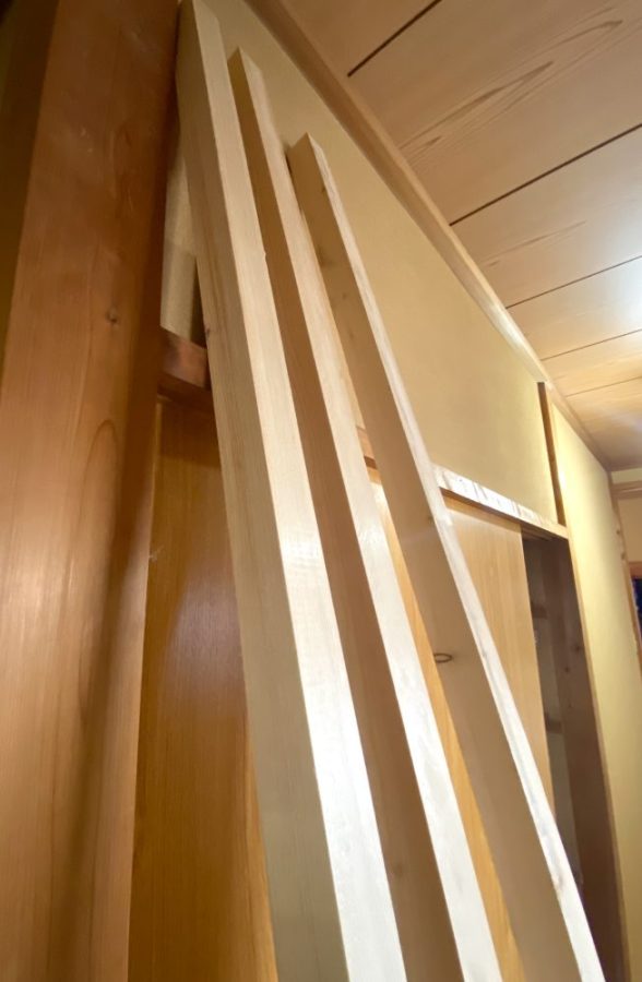 頭上に掲げた角材を、両手で床に下ろす。バーベルのように。先日の「仕切り戸」。軽くて明るくて、床のレールも凹凸がなく。職人のSさんにぴしっと整えてもらって