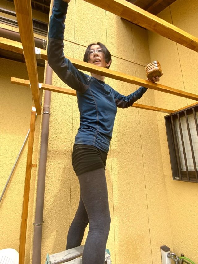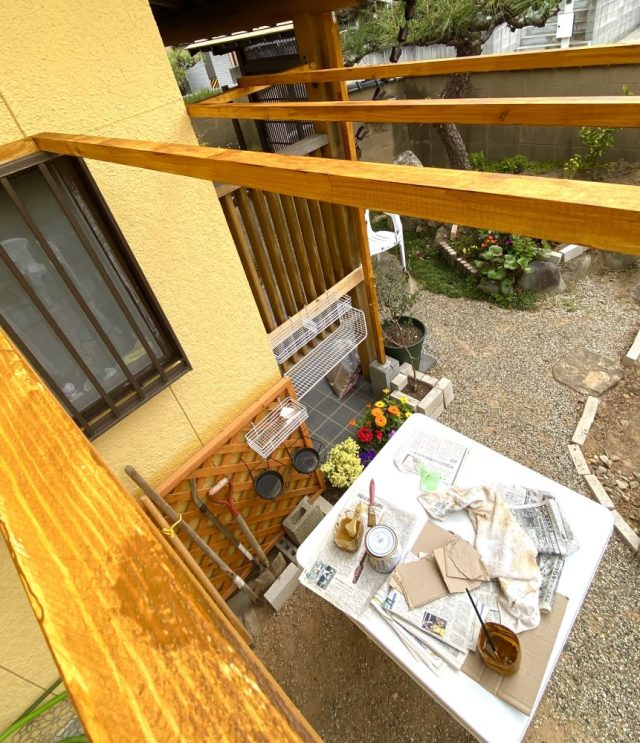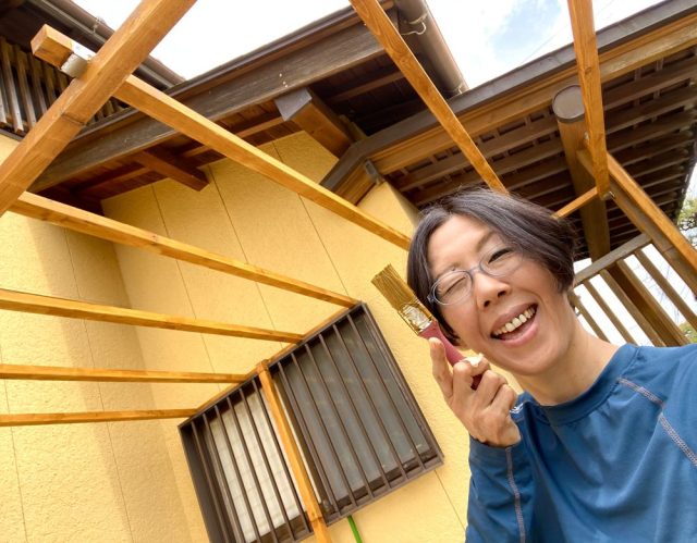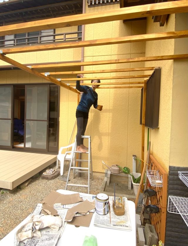 防腐・撥水塗料を塗りまくる〜。脚立に登るのも本日が最後か。不思議なもので、どんどん体幹やバランス感覚が鍛えられ、今ではふつうに