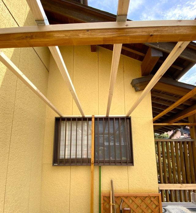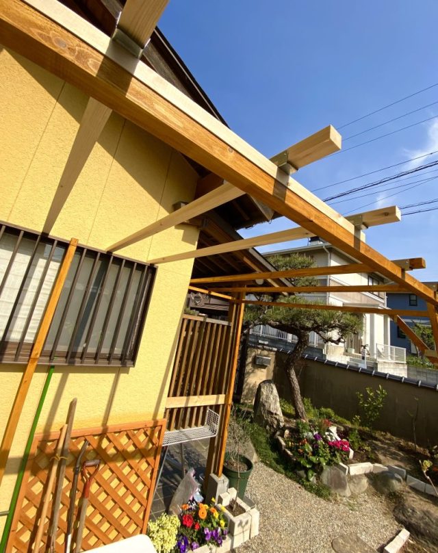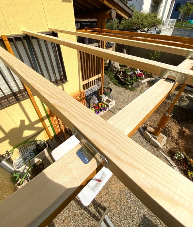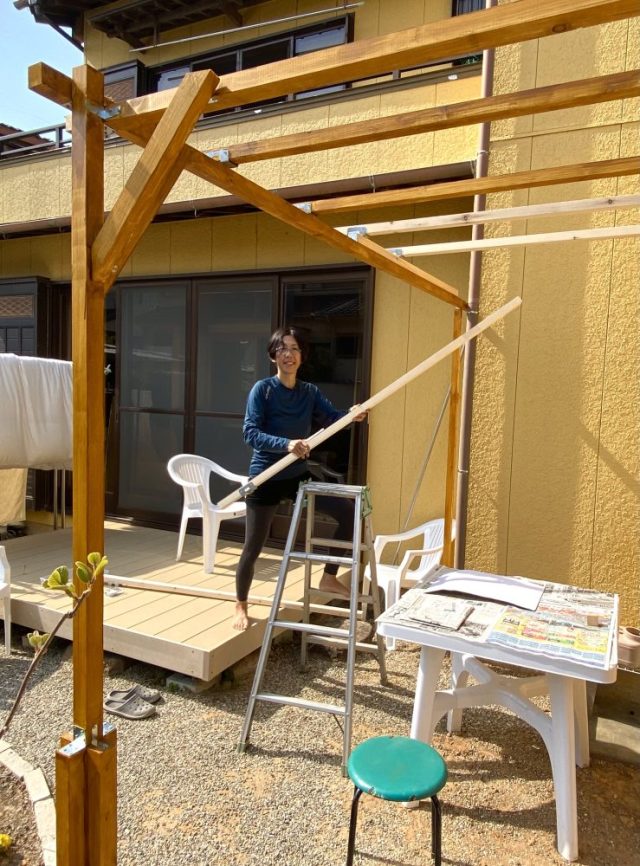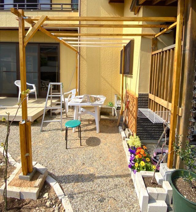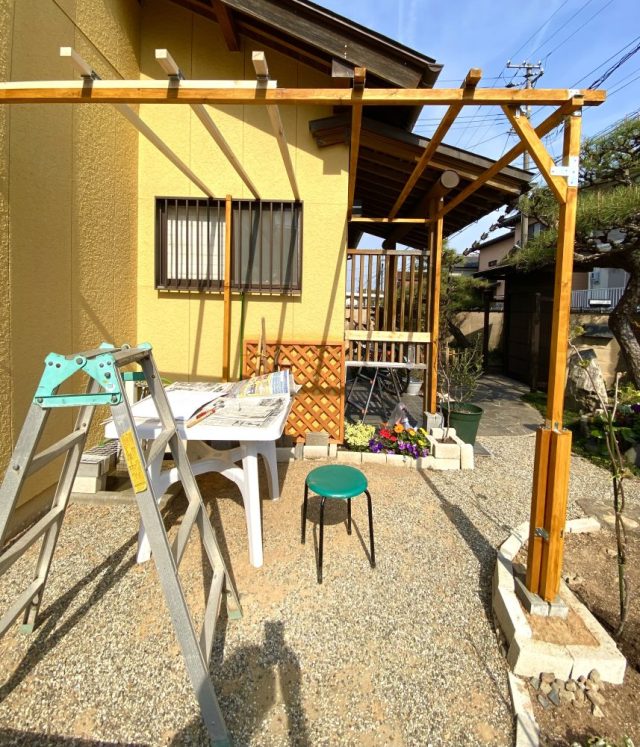 これにて「キウイ棚」の骨組みは全て完了。やった〜。材料費に約2万円かかったけれど(角材、金具、ブロック、セメント、塗料など)しっかり作りたかったので大満足。