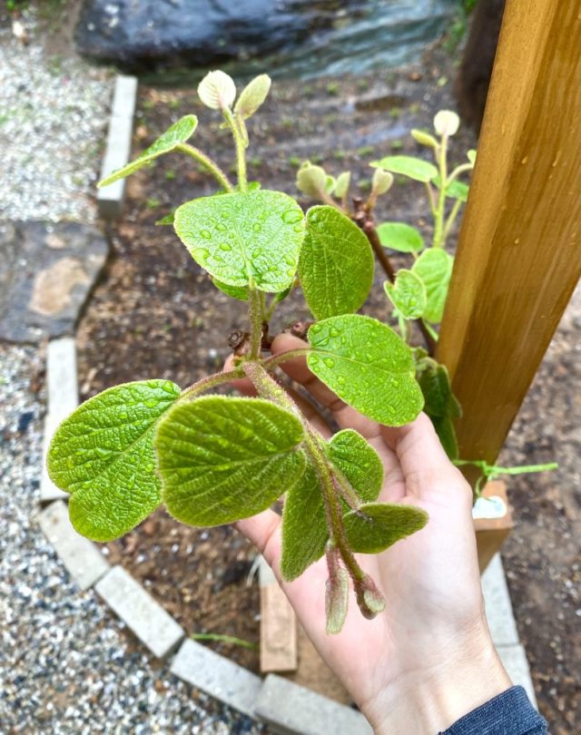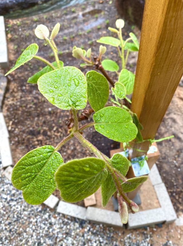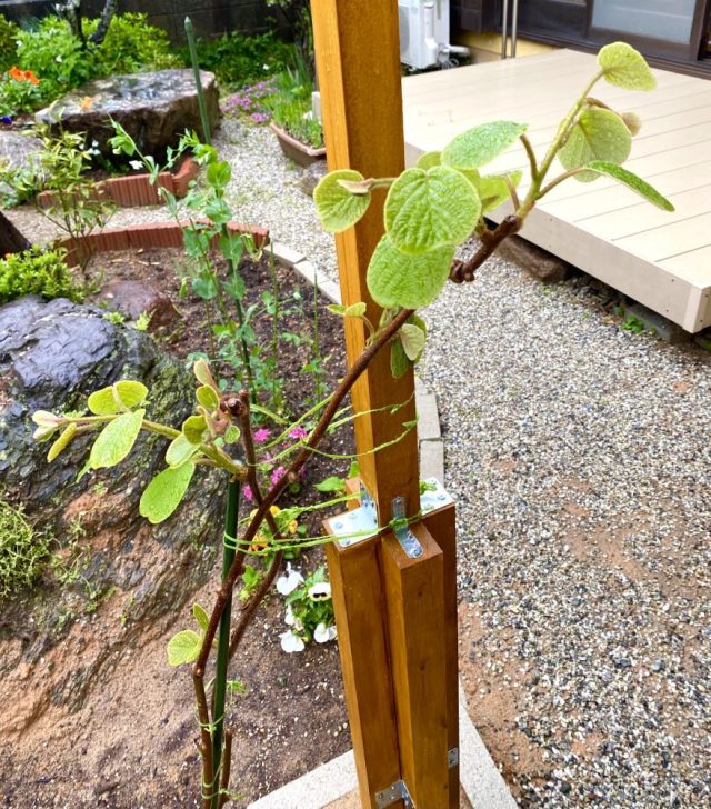 さて。雨の中、傘をさして庭へ出たら、信じられない光景に出会った。「キウイ棚」を作って2日。たった2日。なのに、鉢から大地に植え替えたメスの株が