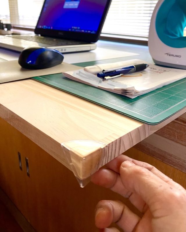 パソコンや血圧計を置けるように。金具を取り付け、角にゴムカバーをつけ。あっという間に父のデスクコーナーのできあがり。前は窓なので明るい〜。