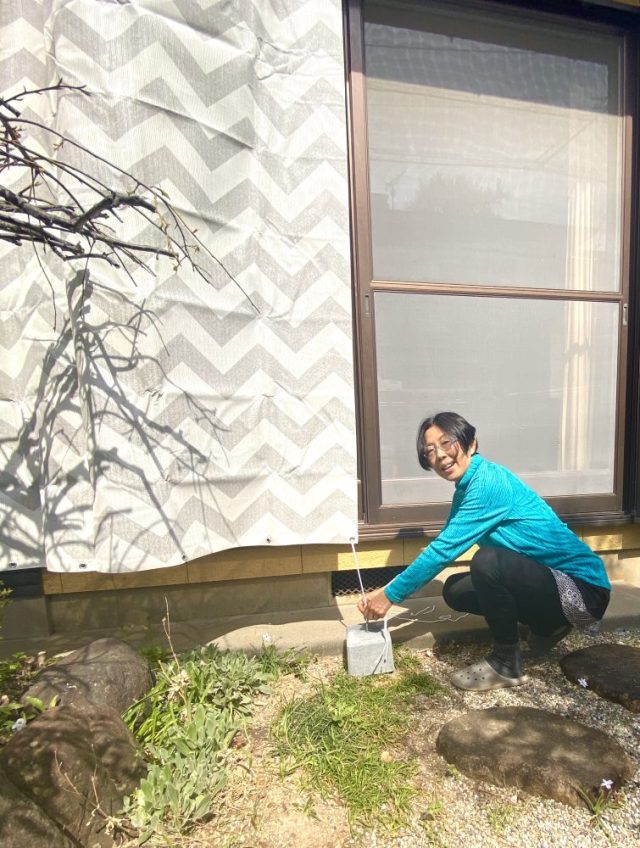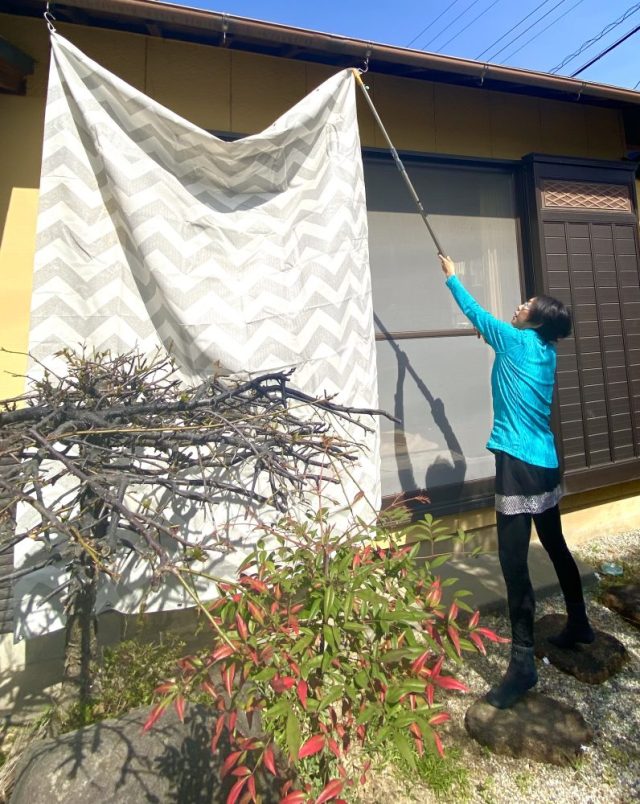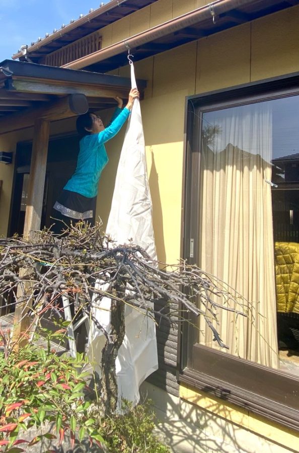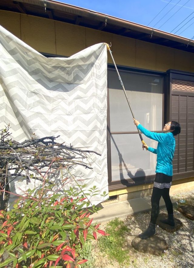 シュミレーション&練習。シェードを引っかけるのに「切れない剪定バサミ」が大活躍。私は脚立に登ればいいけど、父は地上からオペレーション。