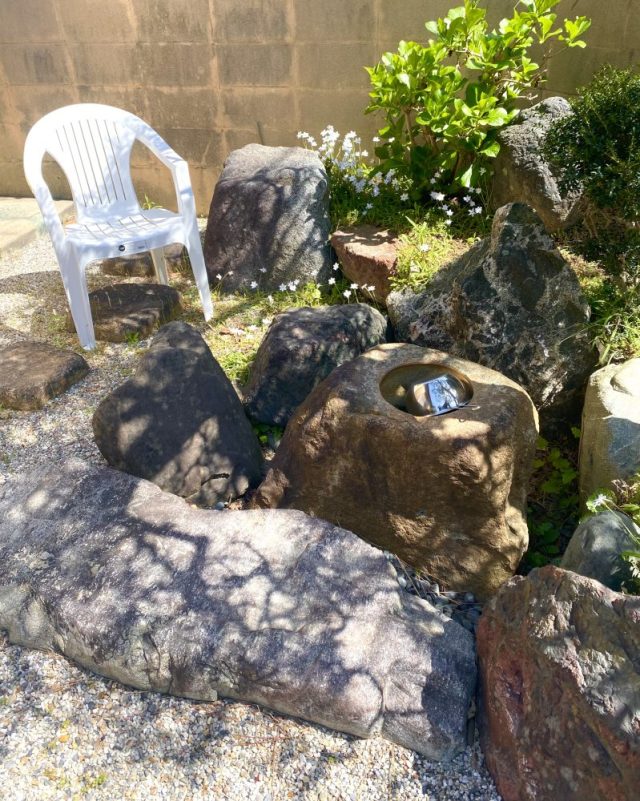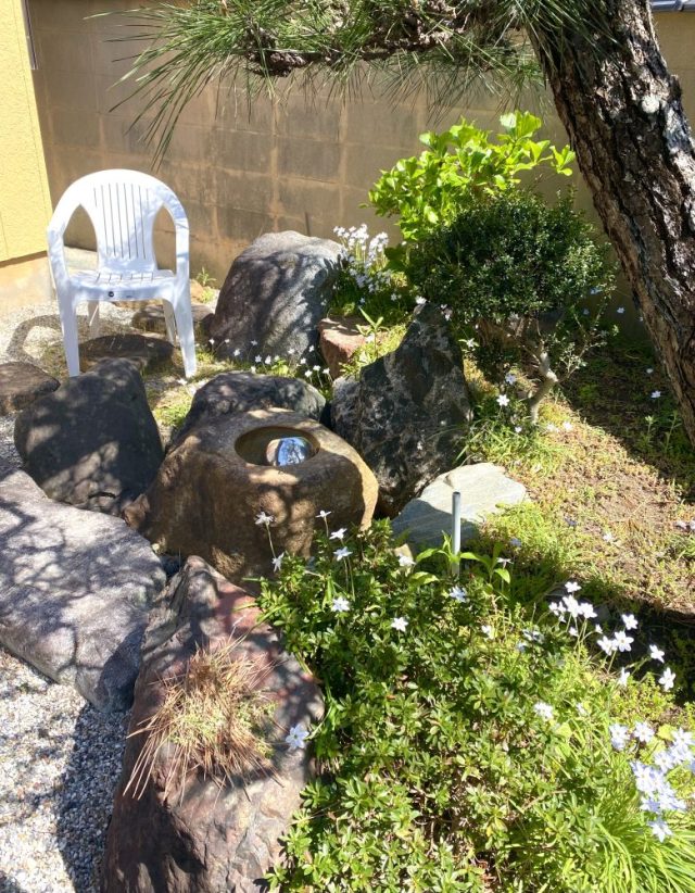 になり、さらに日程も早まり、ドタバタ度が加速。せめて庭でのんびり。もう数年使われていない、ほったらかしの「つくばい」を眺めながら