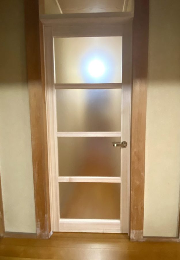 軽くて、明るくて。ヒノキと半透明のアクリル板がいい感じ。これまでのガラス戸の重たさ、閉めるとガチャンと音がするのとは大違い。軽々指1本で、音もなくスムーズ開閉。
