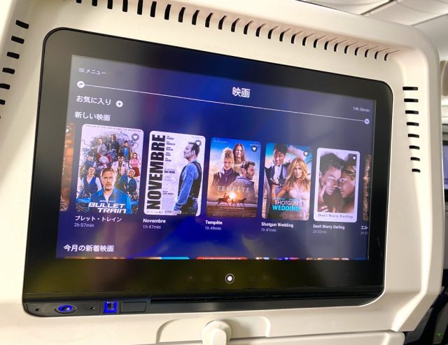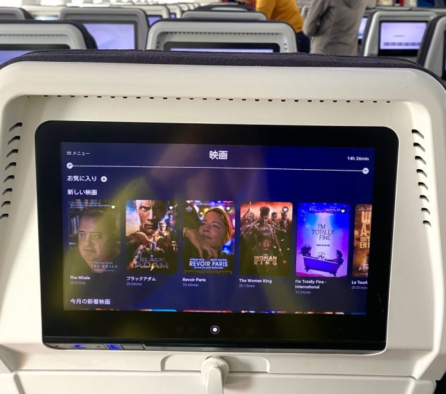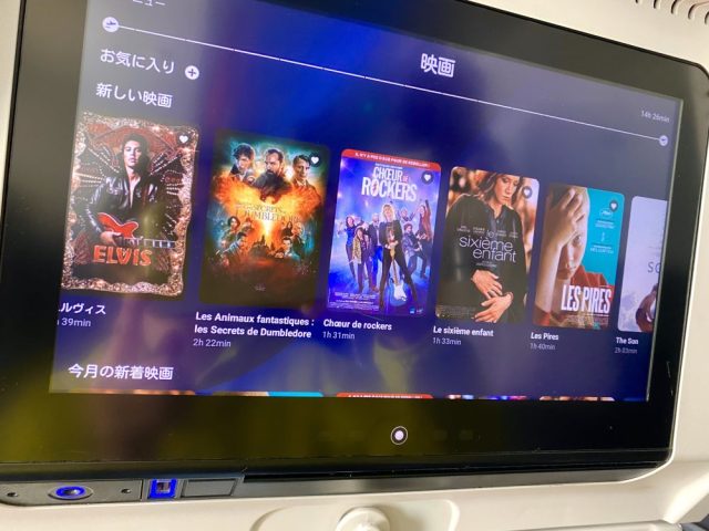 エールフランスは「お一人様用のミニボトル」で出してくれる。このボトルから注ぐのがいいんだよね〜。日本のコンビニで仕込んだおつまみと一緒にちびちびと。食後、腹ごなしに機内を歩き回っていると