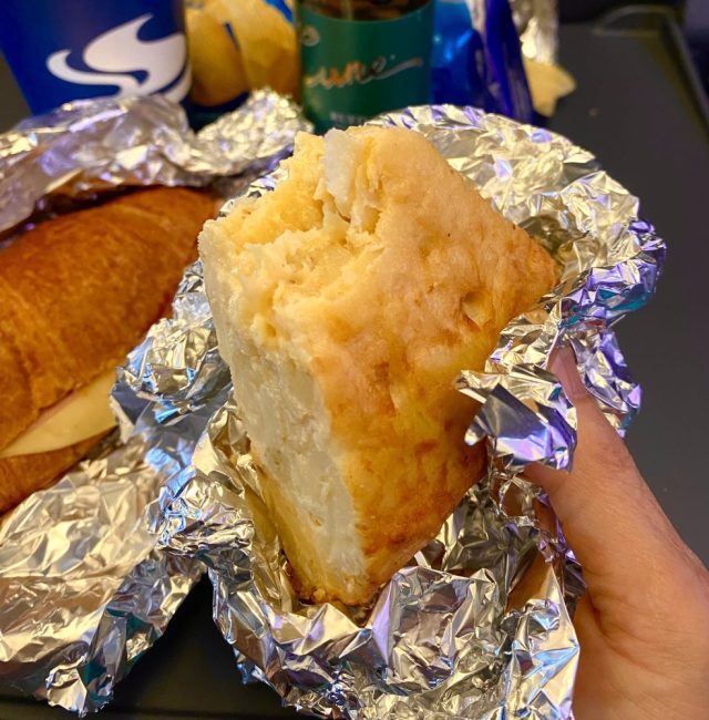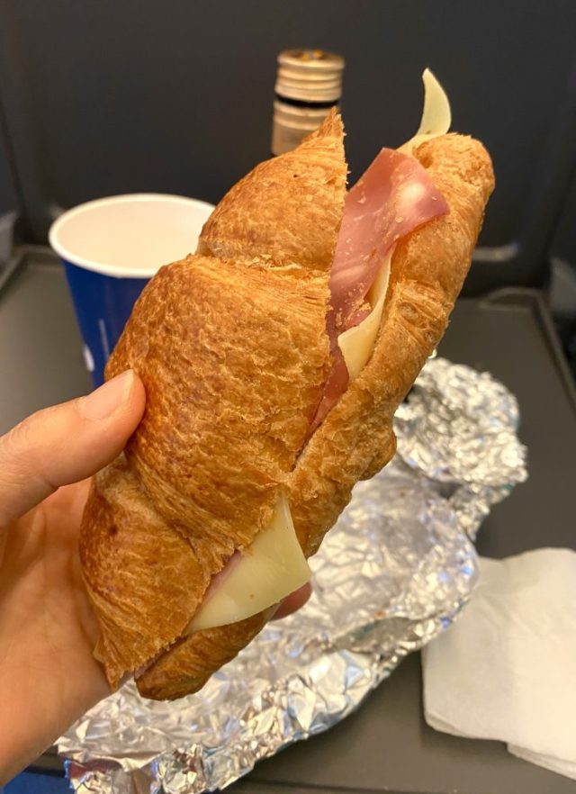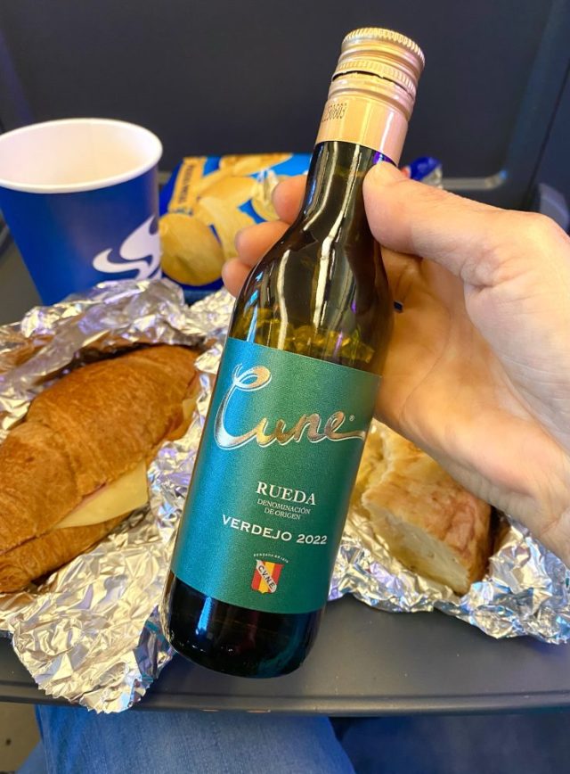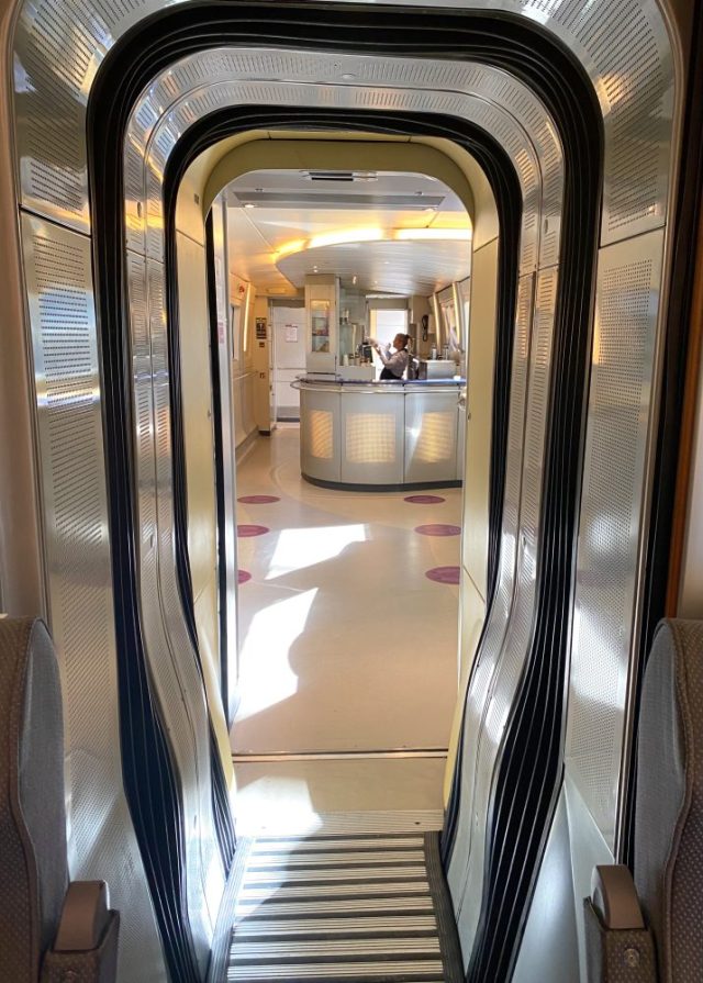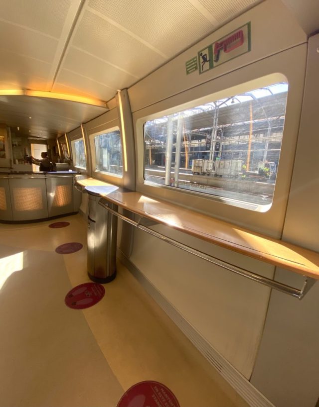 買い込んだハム&チーズクロワッサン、ジャガイモ入りのスペインオムレツ、ワインでほっこり。ちなみに「飲食車両」はこんな感じ(写真)。