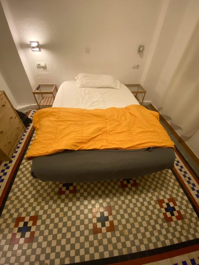 昔風の階段。天井が高くて、床はタイルで。部屋に入ると、いきなりベッド。クローゼットとトイレがベッドの左右についている不思議な間取り(写真)。