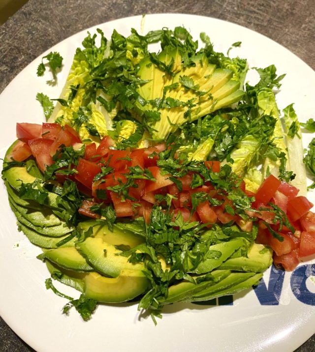 これが、めちゃうま。このチーズの盛り合わせ、日本ならいくらするんだろう。続いて、アボカド・トマト・レタスのサラダ。パクチーとレモン、オリーブオイルで。
