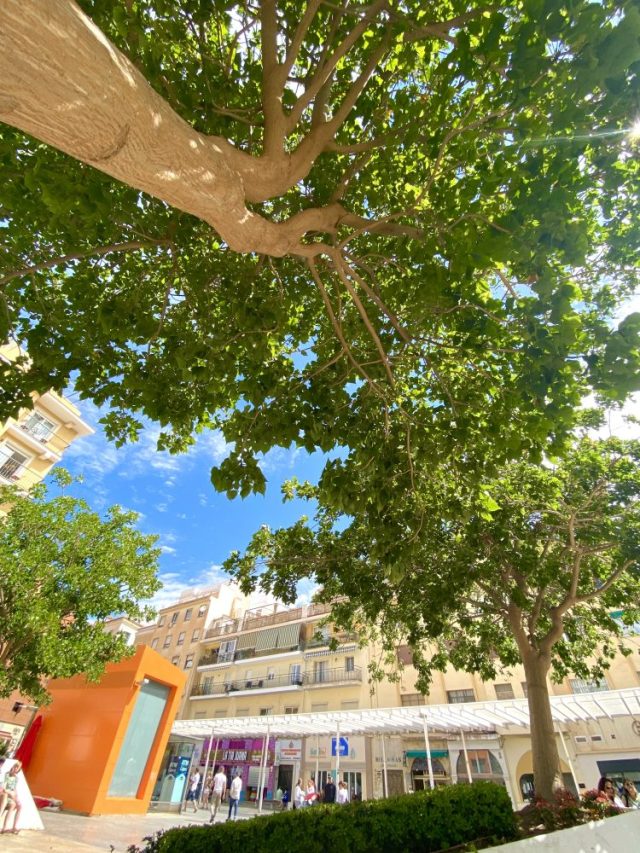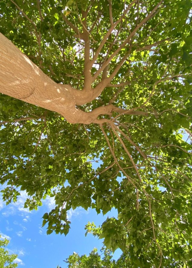 用事をすませ、木陰のベンチでひと休み。見上げれば、すくっとそびえた大樹のすきまから青空が。今週末は30度に届くらしく