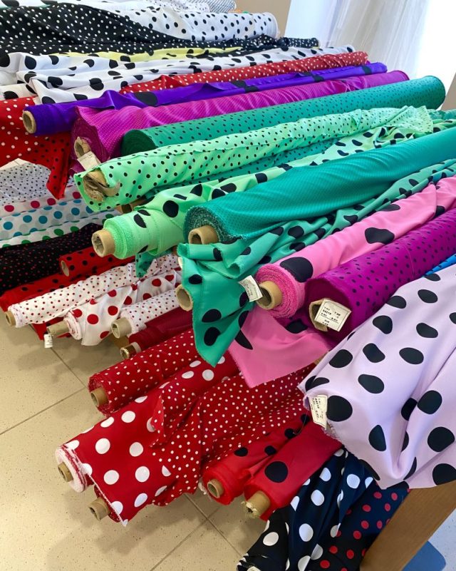 マーメイドスカートに切り替えのひらひら。水玉が揺れる〜。フラメンコといえば「水玉」。生地売り場では色とりどり、大小さまざまな水玉がずらり。スカートが作りたくなる〜。
