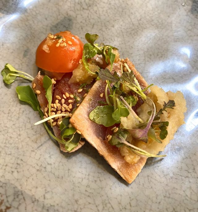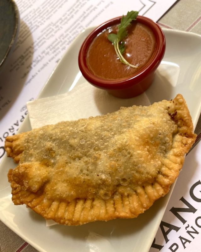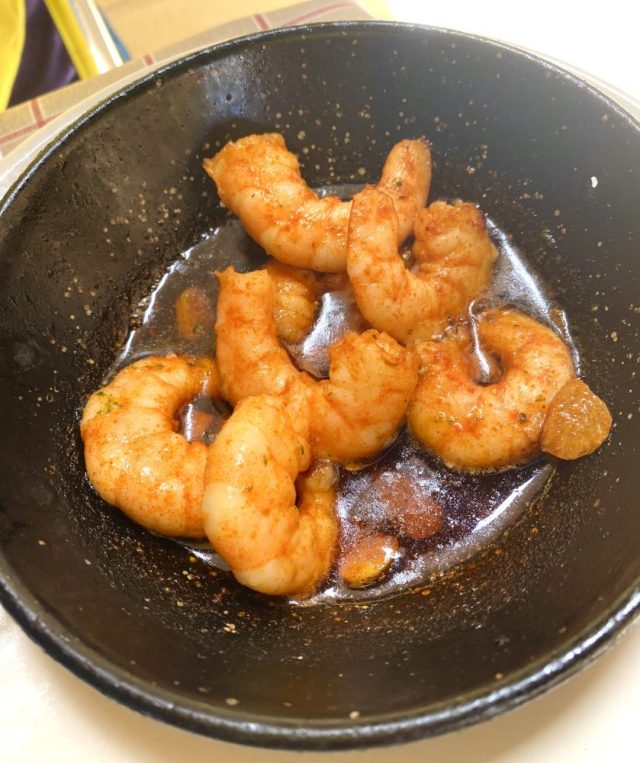 さらにガンバ・アル・ピルピル(ニンニク・オイルで煮たエビ)、マグロの一品など次々注文。味付けや食感が変わるので、どんどん食べられる〜。これがみんなタパスだなんて。幸せやー。