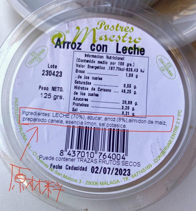スペインでは激安のトマトが、今年は1キロ300〜500円(涙)。もったいなくて、ミキサーにかけられんわー。ところで、デザートの「アロス・コン・レチェ」。原材料を見て驚いた。