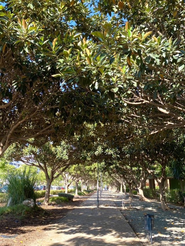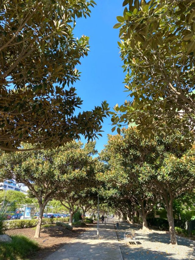さすがマラガ郊外、スペースに余裕あり。あちこちに散歩道や公園が作られている。最寄りのスーパーまでこんな木陰の小道を歩いて行くのだ〜(写真)。