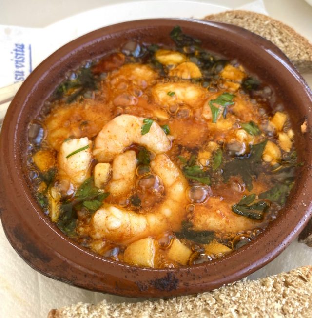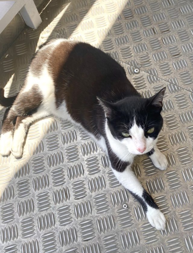1人ぼんやりひと休み。帰りにバルのテラス席で、ビール&ガンバ・アル・ピルピル(エビのニンニクオイル煮)をつまむ。ほっこりくつろいでいたら、ふらりと猫がやって来た。