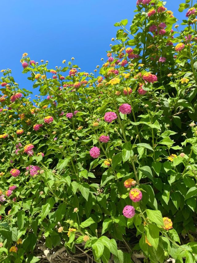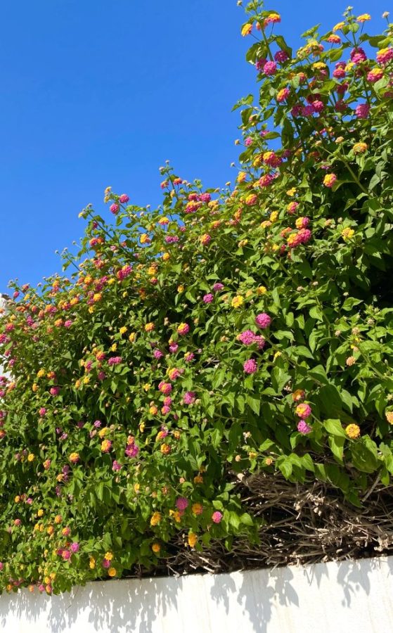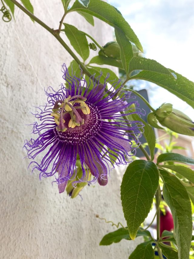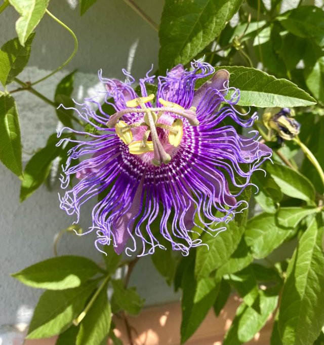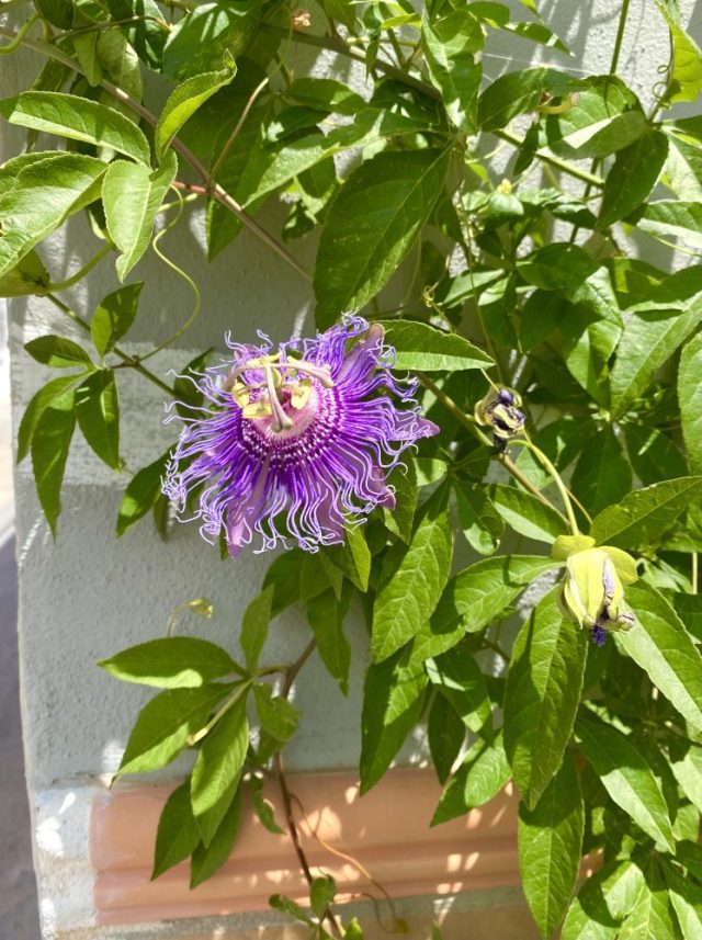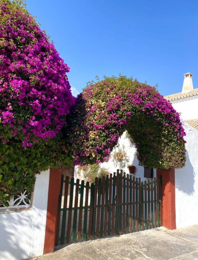 鮮やかな紫色。もじゃもじゃ花びらの中に黄色。なんという配色、デザイン。あまりの美しさに、しばし立ち尽くし目を奪われていた。その先には、ブーゲンビリアのアーチが。おお〜、ゴージャス。
